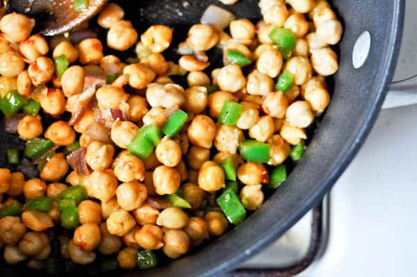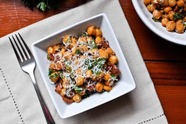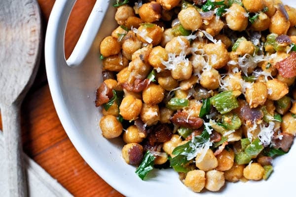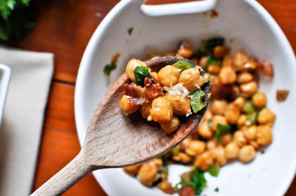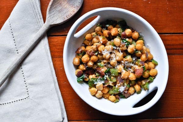 The way I see it, this chickpea concoction should be at the top of your list. It has fiber. It’s kinda crunchy. It has green peppers and red onion and garlic that have been sizzled in salty bacon grease, in turn making it slightly reminiscent of a cheesy pizza coated with bacon crumbles. It’s sprinkled with freshly shaved parmesan cheese that holds everything together like glue. Savory, creamy glue. Delicious right? Don’t worry. Tastes much better than it sounds. Note to self: buy a thesaurus.