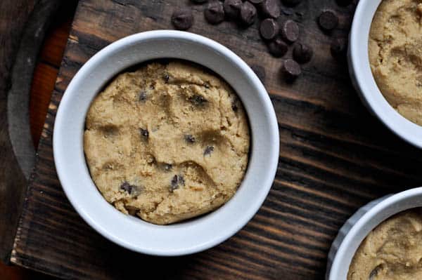 Spray 4 oven-safe ramekins with non-stick spray and divide the dough into 4 equal parts. Press the dough into the ramekin – each one should have about 1/3-1/2 cup dough.
