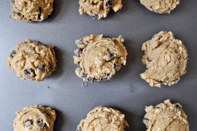 • Remove dough from fridge and roll into big 1 1/2 inch balls. Set on a baking sheet about 2 inches apart. Lightly press down on dough to flatten it. Bake at 375 for 9-11 minutes.