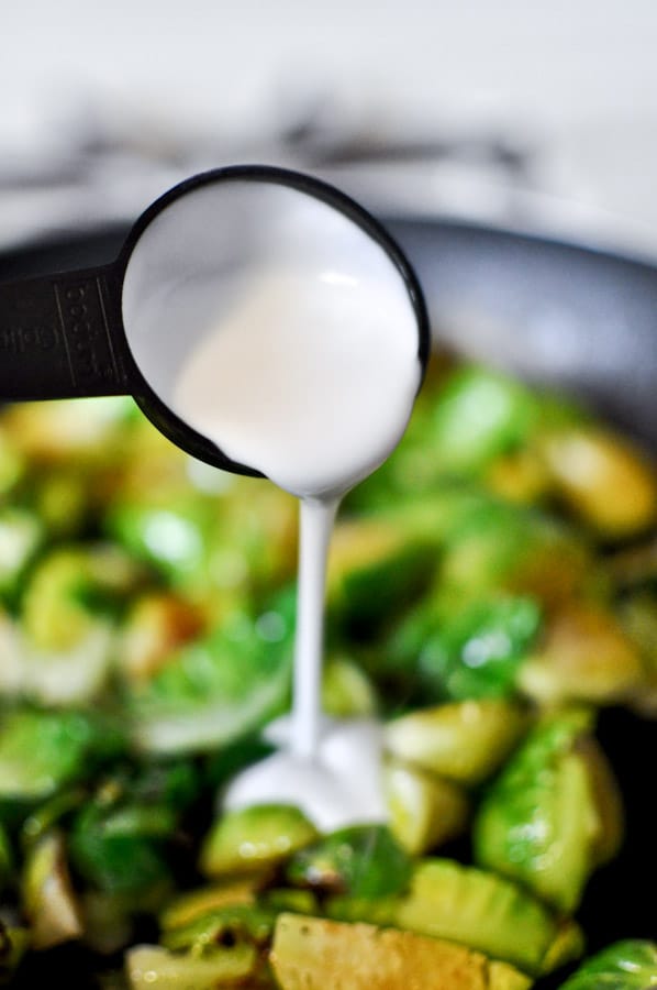 - Heat a skillet oven medium-high heat and once hot, add brussels. Cook for 6-8 minutes, stirring occasionally until toasted and charred. Reduce heat to low and stir in coconut milk. Stir in 2 tablespoons toasted coconut, then transfer to a bowl to serve. Top with remaining toasted coconut.