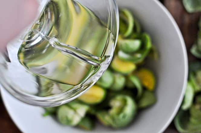 - Add quartered brussels to a bowl and sprinkle with salt, pepper and nutmeg. Drizzle with coconut oil and toss to coat.