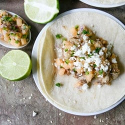 Anyway though: the fruit salsa. Since the jerk seasoning has a lot more spice than most flavors I use on my normal everyday tacos (yeah thatās a thing), I wanted something extra cooling. I do not discriminate when it comes to specific fruit in my salsa and while I often choose berries or something, I stared at the remaining cantaloupe wedge in the fridge and thought it would be perfectly cooling.
