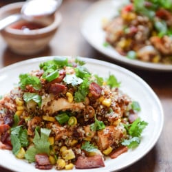 So anyhoo, this bowl of quinoa is certainly a MEAL. It has chicken and beans and bacon and corn and roasted red peppers and I can’t even think of one more thing that it might need.The best part is that it tastes awesome cold, so while the whole oven-turning-on thing is a pain, it’s worth it in the end. Make a big batch, stick it in the fridge. Uh, I actually stuffed this into tortillas one day too. Like BBQ quinoa salad tacos.