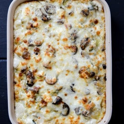 I thought I’d totally blown this when I realized that I’d used 1% milk and the sauce wasn’t really thickening – duh! Also did not have enough brussels sprouts, so I added a sliced zucchini and sauteed it with the mushrooms. Also used only 4 oz shitakke (they’re expensive!) and the rest cremini. But it came out so delicious, my husband said it was one of the best things I ever made!