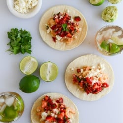 While this shrimp is deliciously spicy and lime, it’s the salsa that obviously gets me. Strawberries, jalapenos and all sorts of flavor piled on top of warm tortillas with crumbly cheese. I also like to serve these with some lime salted napa cabbage on top. The tacos get so full and packed and those are the best kind of tacos.
