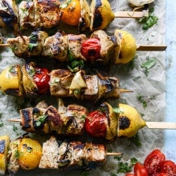 - When ready to grill, skewer the chicken (I made 6 skewers) with a lemon half on the bottom and tomatoes and artichoke hearts in between. You can skewer them however you’d like! Place the skewers on the grill and grill for about 2 to 3 minutes per side, until the chicken juices run clear and the chicken and veggies are charred.