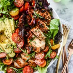 Made this with leftover grilled chicken. Tossed it around in the bacon “juice” to take the chill off and get the extra flavor. SO DELICIOUS and fast for weeknight dinner! For the dressing, if you prefer it less tangy, start with a little less vinegar and add more to taste. Definite Keeper!