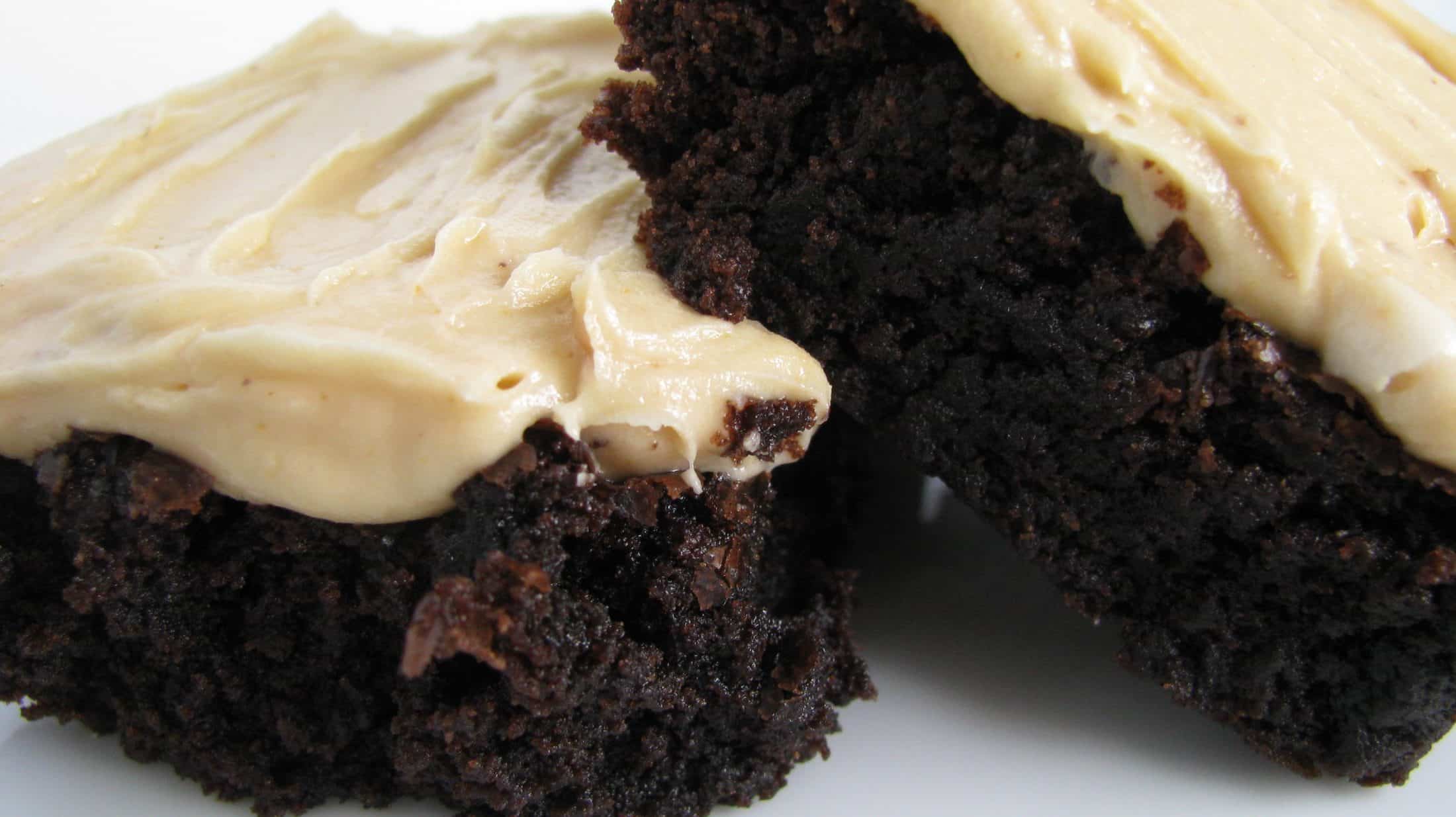 The frosting worked perfectly and saved the somewhat overdone (35 min was way too long in a 9×13 pan) concoction.