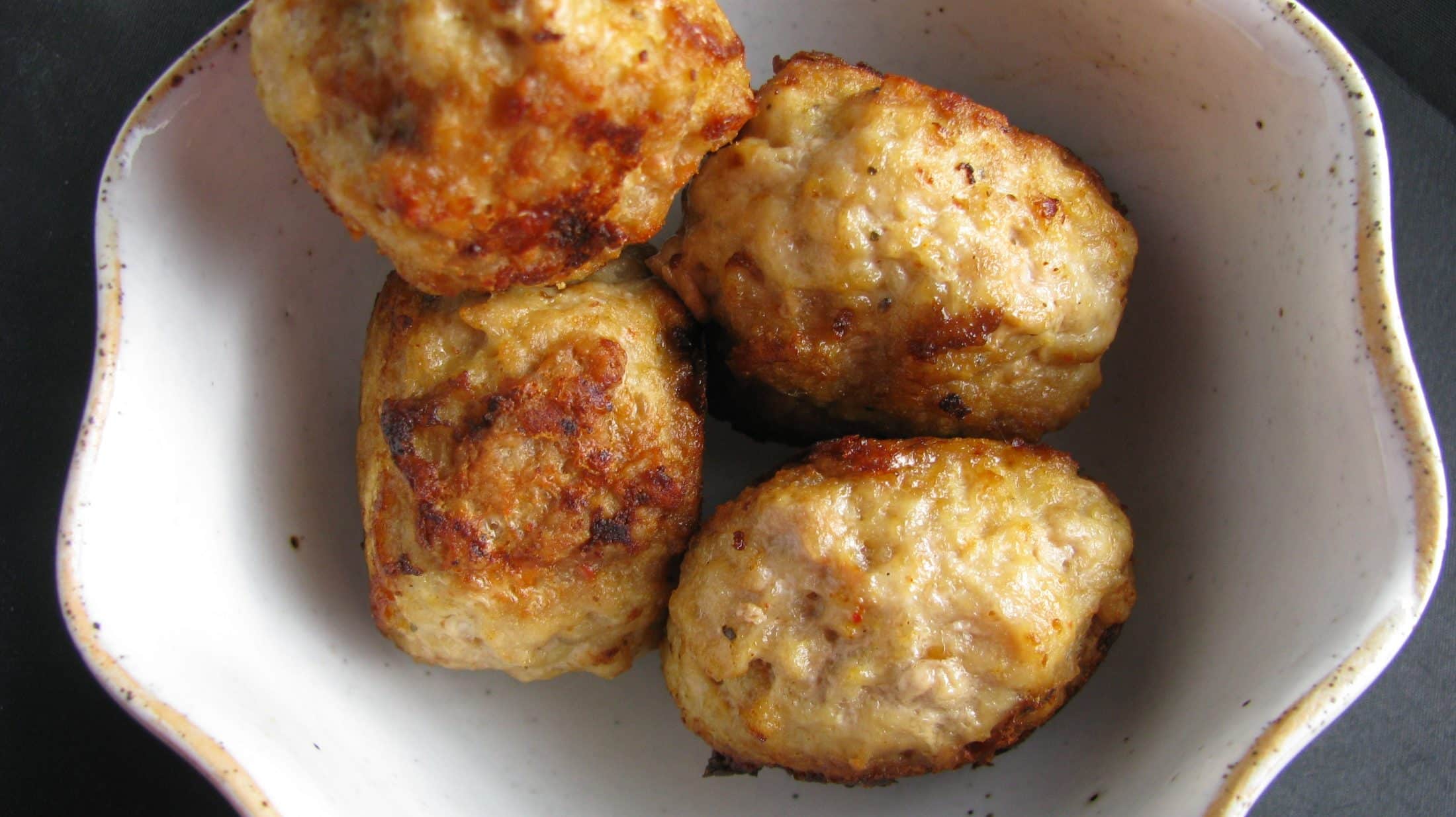 Mix chicken with remaining ingredients. Form into meatballs about 1 1/2 inches thick. Brown in pan on all sides until cooked through, about 10 minutes.