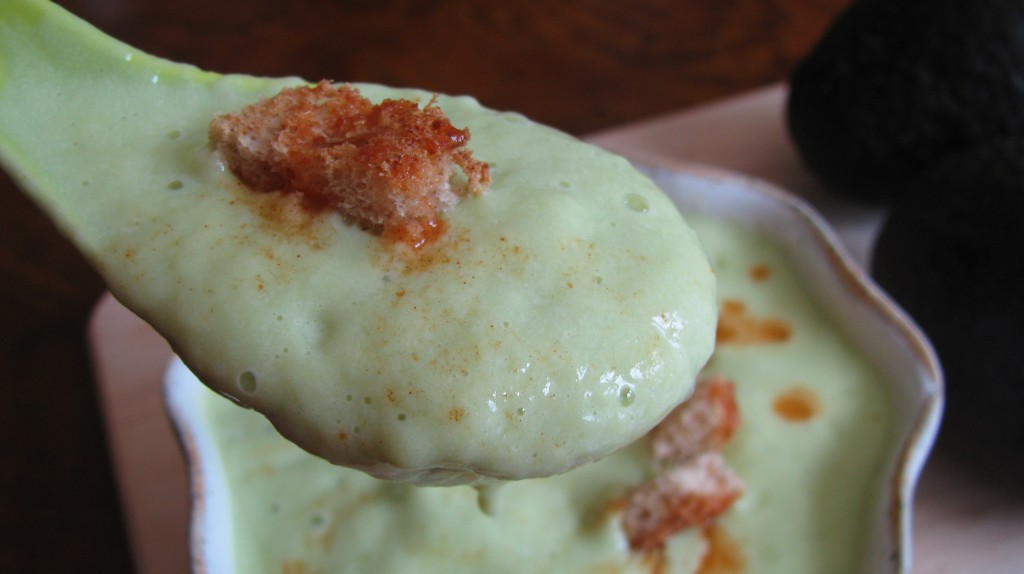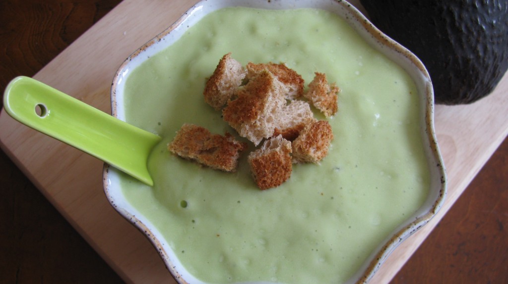 Spicy Avocado Soup with Crunchy Croutons.