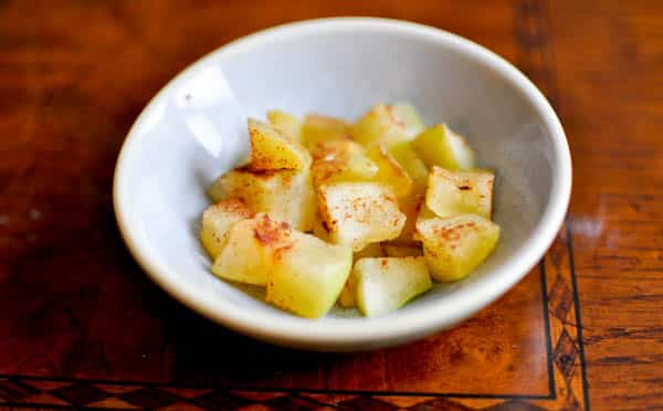 Sprinkle the chopped apples with 1/4 teaspoon cinnamon and a pinch of nutmeg. Microwave (or roast/caramelize) for 60 seconds until apples are soft and sweet.