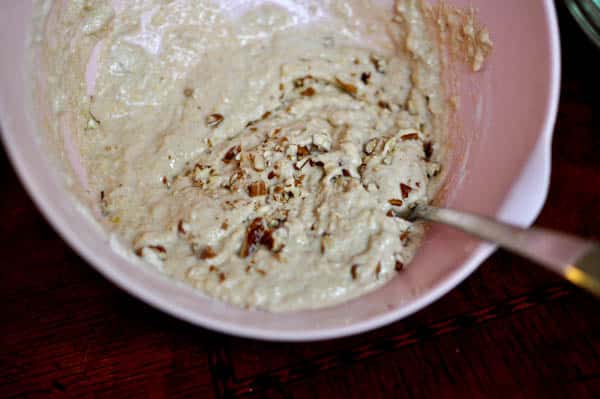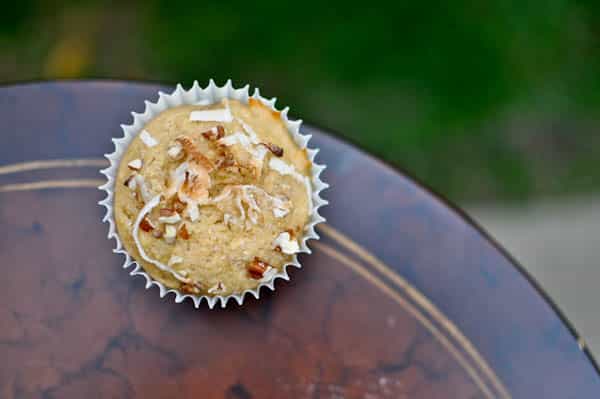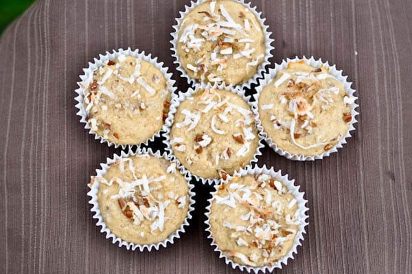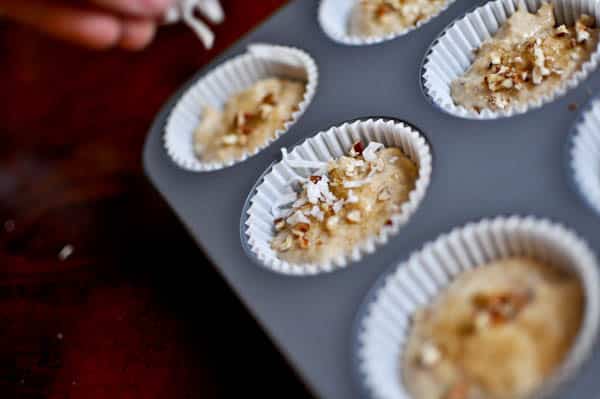 I gave my muffins some “crunch” in two places. First, inside the muffin with pecans. Feel free to use the nut of your choice. Second, on top of the muffins with additional pecans, shredded coconut and course sugar. I adore course sugar.