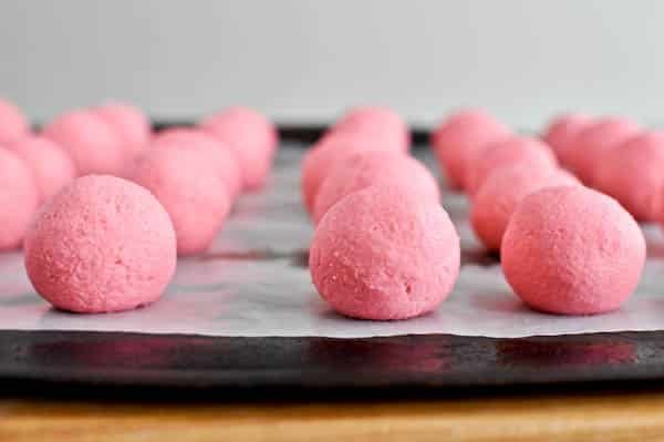 Technically the pink velvet ones aren’t really pink velvet. But along with vanilla extract, I added a drop of chocolate extract for a bit of cocoa flavor. I’ve been making Mr. How Sweet red velvet cake balls for years, as they are one of his favorite treats. Right up there with chocolate chip cookies and Diet Coke.