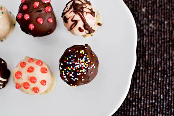 My favorite are the strawberry cake balls covered in milk chocolate, but I also made some vanilla cake balls with a tiny bit of pink food coloring for Mr. How Sweet.