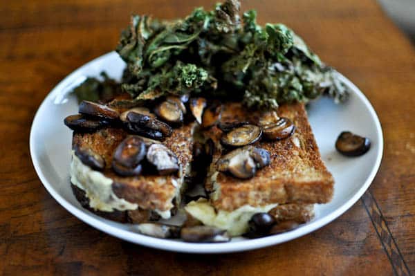 Toasted whole grain bread with tons of mushrooms (inside and out), a bit of Kerrygold aged cheddar and kale chips. It was amazing and I am in love wish mushrooms. My veggie transformation has gone from kale -> brussels -> mushrooms. What do you think will be next?