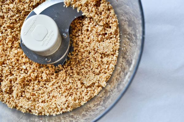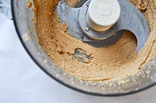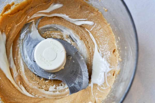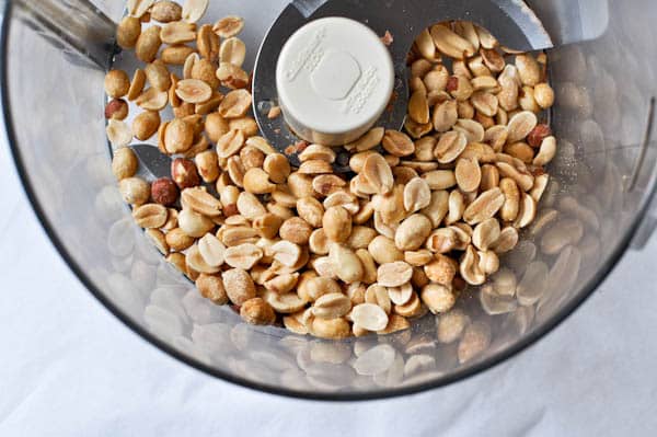• Add peanuts to a food processor and blend until a thick nut butter forms. Stream in oil and vanilla with the processor on, continuing to run it until the mixture is smooth – this took me about 3-4 minutes. You can add more oil if needed, just do it in small increments. Turn off processor, add melted chocolate, and turn processor back on. Blend until smooth.