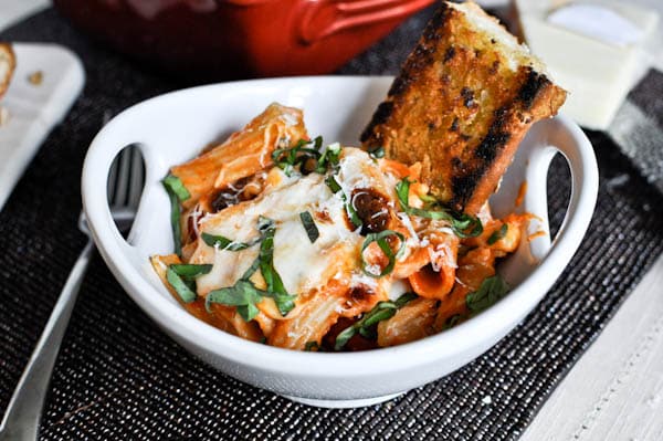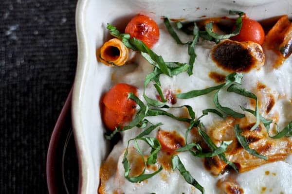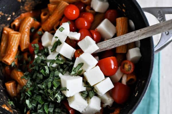 Am I gonna give it up or what? Chewy noodles swim in a light tomato cream sauce. Creamy chunks of fresh mozzarella hide in between pops of grape tomatoes and ribbons of basil, and melt into a gooey, bubbly binder that falls perfectly atop a slice of crusty, buttery garlic bread. It’s almost as perfect as a toasty French loaf topped with a homegrown tomato round, buffalo mozzarella circle, and a solitary silky basil leaf. But better.