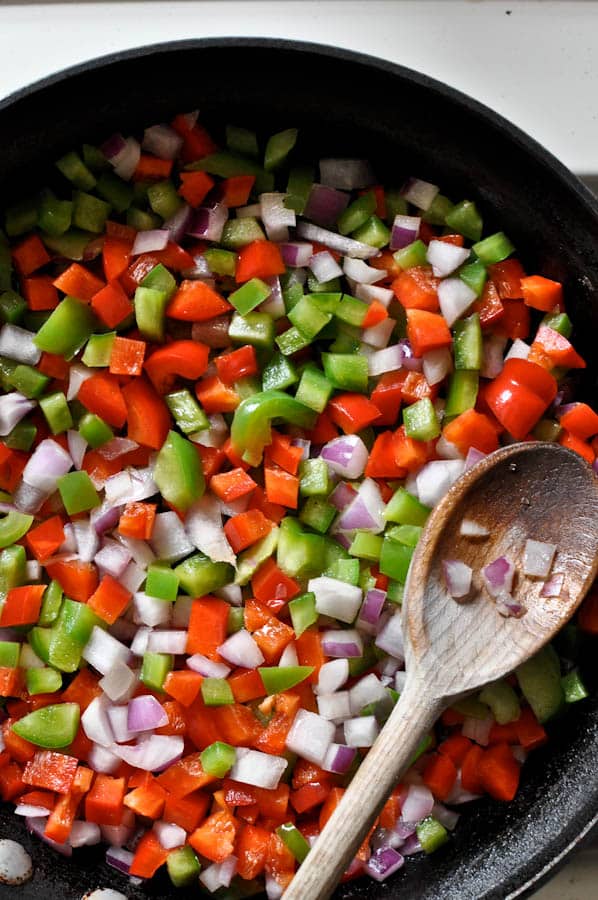 Heat a large skillet on medium-high heat. Chop the 4 raw slices of bacon and add to the skillet. Cook for 3 minutes (no longer), just so a bit of fat is rendered. You do not want the bacon to be crispy at this point. Remove it with a slotted spoon and set it aside in a bowl, then turn heat down to medium. Add in onions and peppers with a sprinkle of salt, and stir. Cook for 5 minutes, continuously stirring. Add in garlic and cook for 3 more minutes. Completely drain clams, then add them to the peppers and onions along with half of the bacon. Cook for 2 minutes. Remove from heat and add a few shakes of hot sauce.