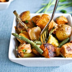 - Chop sweet potatoes (I peeled mine) and yukon golds (I didn’t peel those) into uniform cubes and throw them in a bowl. Cut the fresh green beans in half to shorten each piece and add them to the bowl. Drizzle with 2 tablespoons olive oil and salt and pepper. Using your hands, toss potatoes and green beans until all is coated. Spread them on a non-stick baking sheet. Take the garlic heads and chop off the top to reveal the top of each clove. Rub the head chopped side down in the oiled bowl to coat with olive oil (there should be some left in the bowl that didn’t sick to the potatoes). Place garlic heads face-up on the baking sheet. Bake for 25 minutes, flip and bake for 15-20 more.