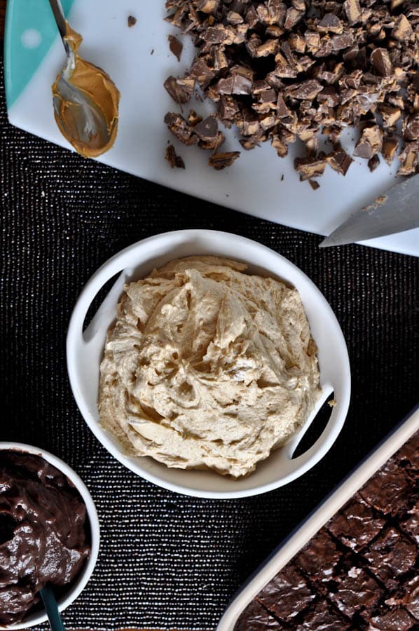 Here’s the deal. Since you’re going to sandwich squares of fudgy brownies between a make-shift peanut butter mousse, I’m telling you to use store-bought things. Of course, you can make your own brownies if you’d like to. But on the last day of summer, creaming and beating butter and sugar for a homemade brownie that was essentially being mashed into a bowl of goop? Not my idea of fun. I did make my own whipped cream, but that’s simply because I had a pint of cream that was ready to go meet Jesus. Otherwise… do your thing: boxed brownies, creamy peanut butter, instant pudding and a big ol’ tub of cool whip. A few bites of this stuff won’t kill you folks. It was the epicenter of the 1990s.