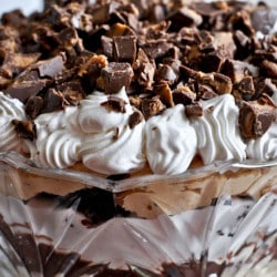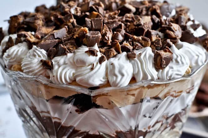 • Grab your trifle dish and begin to layer your ingredients however you’d like. I did a layer of brownies, then peanut butter, then a handful of chopped peanut butter cups, chocolate pudding, whipped cream, and so on. I repeated it until I got to the top, then piped the remaining whipped cream on top and sprinkled the candy on. You really can’t go wrong with layering – just use a long spoon to serve!