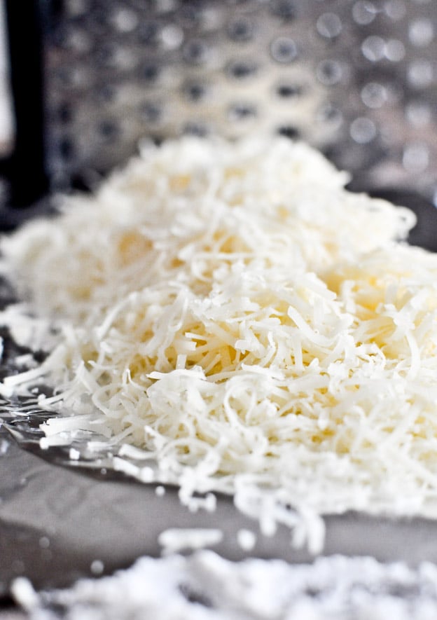 Once doubled, punch down the dough and place it on your counter, using a little more flour if needed to prevent it from sticking. Divide the dough into 12 pieces (I actually got 15) that are 2.5-3 ounces each. Using your kitchen scale here is priceless! Rolls the dough into balls, then places on an oiled baking sheet, cover and let rise for 30 minutes. At this time, grate your cheese and place it in a large bowl.
