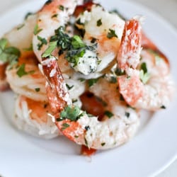 • Add shrimp to a large baking dish. Cover in salt, pepper and olive oil, tossing to coat. Roast for 10-12 minutes (or longer or shorter for the size of your shrimp, I actually roasted mine for 15 minutes because they were super jumbo. Just keep an eye on them and the minute they are pink, remove from the oven.) then remove and slice basil butter over top. Cover in parmesan and another sprinkling of herbs, then serve immediately.