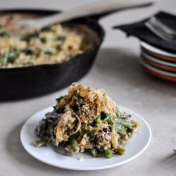 And that’s sort of why I made this casserole. It’s definitely geared towards more of a weeknight side dish or even a weekend dish. Well, what I’m really trying to say is that it’s perfect for a meal that doesn’t involve cooking six or seven other dishes to be on the table at one time. Like Thanksgiving. HOWEVER. It is still totally doable on Thanksgiving, especially if you are serving a smaller group or making just a handful of dishes. You can make it for a large group if you prepare it ahead of time and the good news is, large group or not, aside from boiling the green beans this dish is made in ONE SKILLET. Boom.