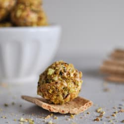 • Roll the goat cheese into 1/2-1 inch balls (or smaller or larger, depending on your preference), then roll through the pistachios to coat. Set on a plate and refrigerate for at least 30 minutes before serving. These can be made well ahead of time – I’d say at least about 3 days.