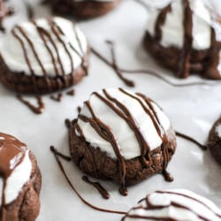 I wish I could say these are some sort of fancy peppermint pattie cookie, but they are really just a delicious chewy chocolate cookie stuffed with dark chocolate chunks, covered in the most perfect homemade peppermint cream and drizzled with ganache. It might even taste better than a real peppermint pattie. Which I love, by the way. I hoard those things. They are what I eat when I want to feel healthy but crave something sweet. I mean, dark chocolate? Antioxidants. Peppermint? I dunno… good stuff there I’m sure. All I’m saying is that they are basically a slightly higher caloric breath mint.