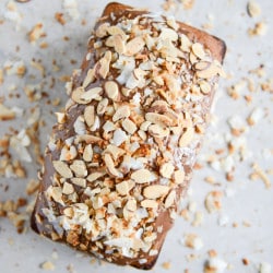 - Once the cake has cooled, remove it from the loaf pan. Drizzle the chocolate on top, then cover with the coconut and almonds. Serve!