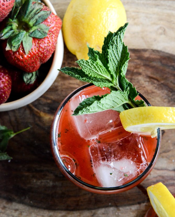 - Add strawberries and mint to a blender, pureeing until liquified. Add in lemon juice and simple syrup, pureeing until combined. At this point you can choose to keep the mixture thick with the fruit puree, strain half of it to lighten it a bit or strain all of it to remove the strawberry pulp. It’s up to you! Pour mixture into a pitchen and stick in the fridge for 20 minutes until cold. Serve over ice.
