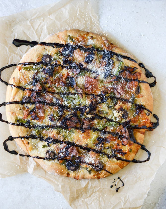 What I think I love most about this pizza, however – besides the balsamic glaze – is that the asparagus spears get a bit crispy too. You know I like to roast the heck out of my vegetables, like roast until they are near death, and if you put super skinny spears on your pizza, they will roast perfectly. And if all this jazz isn’t your thing, I made asparagus pizzas last year with bacon and eggs that were, um… pretty darn good. I might make one tonight. Darn, it feels like I just made those yesterday. SLOW DOWN TIME.