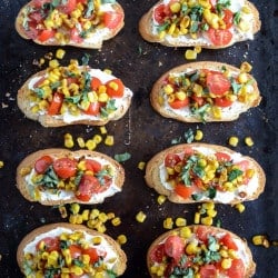 • To prep crostini, spread each slice with goat cheese then top with a handful of tomatoes, grilled corn and fresh basil. Serve!