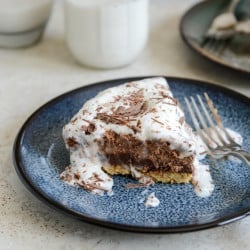 • Right before serving, whip the other 1 1/2 cups of cream (just like you did when you started for the truffle layer) and spread on top of the pie. Cover with chocolate. Serve immediately.