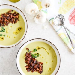 Creamy Caramelized Leek Soup with Maple Glazed Bacon.