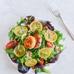 Crispy goat cheese was one of the first things I put on a salad that made it on to this blog way back in the day. Ohhhh the embarrassment. In this recipe, it’s tangy with a little heat. The perfect compliment to the sticky and sweet lemon rounds.