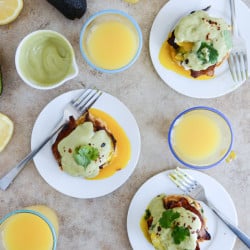Sweet Corn Cake Eggs Benedict with Avocado Hollandaise
