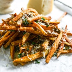 - Add the oil to a large pot and heat over medium heat until the temperature reaches 350 degrees. You can do this while the potatoes are soaking. You really NEED to use a candy thermometer for this to ensure that the oil doesn’t get too hot. One the oil is hot, add the potatoes in batches and fry until slightly golden, about 2 to 3 minutes. Remove the potatoes and place them on the paper towels to drain. Let all of the potatoes cool for about 10 to 15 minutes, then make sure the oil is still at 350 and fry them in batches again. This time, you want to fry until they are even more golden and maybe a little puffy. Remove and place on the baking sheet again quickly, but this time you can let them drain for a second and them throw them on a plate or a sheet of parchment paper. Cover immediately with lots of the herb salt. Add the parmesan and toss, toss, toss. Taste to see if they need more salt or cheese. Of course they do!