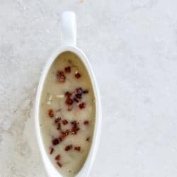 • If you love a super smooth gravy, you can add this entire mixture to a high-powered blender and (very carefully) blend until smooth. While I don’t like chunky gravy, I certainly don’t mind the shallots and bacon. Add the remaining bacon in right before serving so it stays crispy.