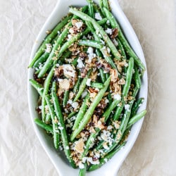 • Add the green beans to the skillet. If there isn’t any bacon fat left, you can use butter or olive oil (about a tablespoon) to toast the beans. I find that the beans are seasoned enough with the bacon flavor and feta, but you can add some salt and pepper here if you like. Cook the beans over medium heat, stirring and tossing occasionally, until they are bright in color and cooked – but still slightly crunchy – about 5 to 6 minutes. Add the shallots and bacon back into the skillet and toss. Toss in the toasted almonds and feta.