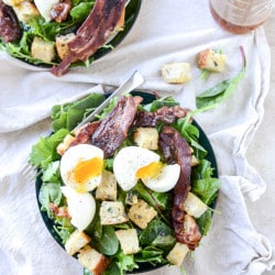 You can use whatever greens you’d like, but I mixed some baby kale and baby spinach together for a powerful kick. Then you put all sorts of delicious things on top, like the crunchiest bacon in the universe, soft boiled eggs split open just before eating and covered in salt and pepper (I used the recipe here from Stephanie’s book!), buttery garlic herbed toast made into croutons and then a heavy handed pour (drizzle? no.) of maple bacon vinaigrette.