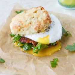 - To serve, add the arugula, bacon slices and egg on the biscuit. Eat up.