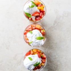 • Pour about half of the syrup into the fruit and stir well. Taste and add more if desired – the fruit will be juicer at this point too. I like to chop a little more mint and throw it in. To serve, spoon into bowls then place a dollop of the marshmallow frosting on top. You can drizzle more bourbon syrup on and add a few mint leaves. Enjoy!