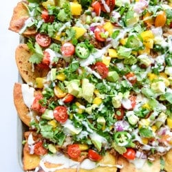 • To assemble the nachos, lay the chips in a layer on a large baking sheet (I like to cover mine with foil first). Sprinkle on the grated cheese then add on the pork. Drizzle on half of the queso. Place the nachos in the oven and cook until heated through and the cheese is melted. Remove the nachos and cover with the scallions, peppers, avocado, cilantro, mango, tomatoes and red onion. Drizzle more queso on to before serving!