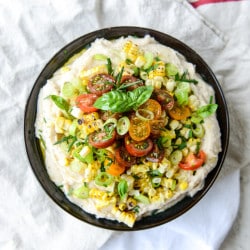 - Top the dip with layers of the grilled corn, tomatoes and scallions. Finish by topping with some basil leaves and extra herbs. I like to add another sprinkle of salt and pepper along with a drizzle of olive oil. Serve immediately with pita chips or crackers, raw veggies or baguettes.