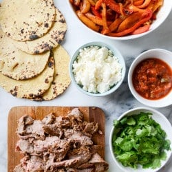 - After 10 minutes, slice the steak against the grain in to super thin strips. Serve the steak with the peppers on top – in your fajita vehicle of choice!