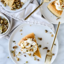 How much more do I need to sell you: fluffy pumpkin cheesecake on top of chewy pistachio crust, topped with whipped cream (flavor it if you want!) and a crunchy crumble. Eeeeeep, I am SO deep in cheesecake lust. What else could a texture lover want? NOTHING.