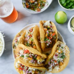 Managing a large pot of scalding hot oil was enough for me to deal with while having a clingy snuggabug at my toes, so I figured I’d give it a whirl and try some of my favorite store bought corn tortillas – and it totally worked! The key is checking out the ingredient list, looking for that masa and going from there. I used the la tortilla factory yellow corn tortillas because we are addicted. So I can assure you that those ones work. Buuuut I probably just bought them all from your store so there’s that.