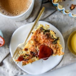 I’m not into frittatas either (they get too dry!), but I love quiche. I did question what I thought was ketchup for a second – lol! Sriracha is perfect for this tho. The bacon grease potatoes are all I needed to hear.